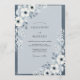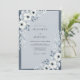 This design evokes a serene, artistic mood with delicate white anemones and flowing greenery in a soft slate blue palette. It brings a touch of ethereal elegance, perfect for a romantic occasion. The artwork features painterly floral arrangements.