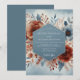 Set a tone of artistic elegance for your special day with this stunning design. A beautiful arrangement of lush terracotta poppies and dusty blue blooms is rendered in a soft watercolor style. Delicate sprigs of foliage in complementary shades create a romantic, botanical composition against a pale blue wash, perfect for a sophisticated autumn or winter union.