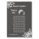 Simple rustic wedding table number card with seating names for up to ten guests per table card. Designed in slate grey and white chalk style graphics and lettering. Double sided design with mirrored details on the back. All formatted and ready for you to replace the numbering and all text on one card at a time. Edit and add each card to the cart separately. You should only need to edit one side for the edits to appear both front and back, but double check both sides before adding to the cart. Don't forget to edit the bride and groom names and date on each as well. Coordinates with the wedding invitation, RSVP and a whole wedding stationery collection at www.zazzle.com/monogramsandmonikers
