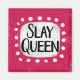 A fun and cute typographic design that says "Slay Queen". It's black text on a white rectangle with funky, playful white dots surrounding it, all on a hot pink magenta background.