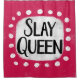 A fun and cute typographic design that says "Slay Queen". It's black text on a white rectangle with funky, playful white dots surrounding it, all on a hot pink magenta background.