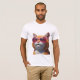 Elevate your look with this sophisticated T-shirt. It features a photo-realistic 3D orange cat in pink retro sunglasses, masterfully rendered against an electric blue backdrop with subtle shadows for a sleek, high-end feel.
