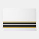 This sporty design features black bottom edge double horizontal racing stripes and adjoining floating golden brown pinstripes.  The background is white.