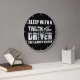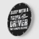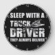 This wall clock features a humourous and somewhat suggestive slogan for those connected to the trucking world. Against a black background with a white rim, it displays the bold, distressed text "SLEEP WITH A TRUCK DRIVER THEY ALWAYS DELIVER" in white. A subtle graphic of a semi-truck is also present, making it a playful and unique piece of decor.