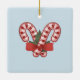 On this cute ceramic Christmas ornament, a sleeping angel is shown while, on the other side, two candy canes are shown