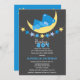 © 2013 Socialite Designs. Cute blue teddy bear sleeping on the moon baby shower invitation for a baby boy. The design also has a star banner and whimsical "baby boy" text hanging from the banner. The back of the invitation has a blue background with yellow stars. All design elements can be moved, resized or deleted to suit your event. Background colours can also be changed by customising it.