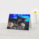 The design on this greeting card is an original photograph of a cat sleeping in front of a television. The cat is a calico, with white paws coming toward the camera. A program about finance is on TV, with a bright blue graphic including the words "VENTURE CAPITAL FUNDING". Under the cat, showing her interest in financial matters, are the words "VENTURE CATIPALIST", in text with a cat fur pattern and a blue glow behind it, like the blue glow behind the cat's fur at its edges.