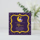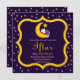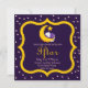 Invite people over for Iftar or Eid celebrations during Ramadan. Design features a sweet cat with a purple blanket sleeping on a yellow crescent moon with star. Purple and gold border with pink stars.