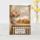 A peaceful ginger cat sleeping on a windowsill beside soft flowers, with a snowy winter landscape outside. Warm tones and gentle light create a cosy seasonal atmosphere.