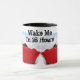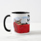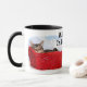 The facts are on the mug! This ringer mug displays an altered digital photograph of an adorable black and brown pink nosed tabby sleeping in a bright red basket on the left and right with template text between. The text refers to the fact that cats sleep 13-16 hours daily. Under "Personalise it" fill in the template field with your information, remove the text and/or use the edit design tool to select a font style, size and colour you prefer.