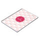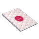 A spiral notebook with a custom name and monogram initial inside a pinkish red circle. Designed with a cute pattern of sleeping kitty cats all around looking peaceful and happy. Pink background.