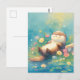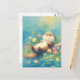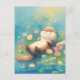 This peaceful postcard features a blissful otter floating contentedly on a log in a sparkling summer pond. The artwork is rendered in a soft, ethereal watercolor style with a vibrant palette of turquoise, sunny yellow, and delicate pink. Surrounded by dainty wildflowers and shimmering light orbs, the scene captures a moment of pure serenity. The gentle textures and dreamy atmosphere make it a wonderful choice for sending a note of calm and relaxation to a friend or loved one.