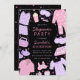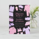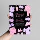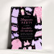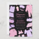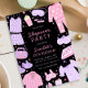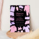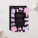 Invite guests to your slumber party with our Sleepover Birthday Invitation. Pink and purple design featuring pyjamas, sleep masks, slippers, pizza, popcorn, nail polish, and more fun PJ party elements.