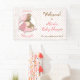 This banner is a great way to greet guests arriving at your baby shower! It features an adorable, sleepy little brown teddy bear with a pink and white striped cap and pink blankets. The image is framed in a thin brown line circle, and set against a pink and brown polkadot background. There is a custom text field in darker pink at the top and bottom, and your information is in brown and matching pink at the right.