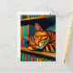 Comic book style cartoon cat sleeping on a shelf of books. A cute postcard to keep in touch.