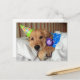 Ever been tired after a long day celebrating your birthday? This postcard features a photograph of a cute golden retriever dog tucked into bed, while wearing pyjamas and a party hat and holding his teddy bear. Time for sleep!