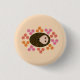 This button features a cute cartoon of a little brown spiky hedgehog curled up in a ball looking sleepy. The Hedgehog is surrounded by pretty flowers. The hedgehog is brown with a cream face and the flowers are red, orange and pink.