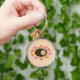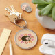 This fun keychain features a cute cartoon of a little brown spiky hedgehog curled up in a ball looking sleepy. The Hedgehog is surrounded by pretty flowers. The hedgehog is brown with a cream face and the flowers are red, orange and pink.