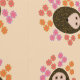 This awesome patterned wallpaper features a cute cartoon of a little brown spiky hedgehog curled up in a ball looking sleepy. The Hedgehog is surrounded by pretty flowers. The hedgehog is brown with a cream face and the flowers are red, orange and pink.