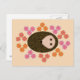 This postcard features a cute cartoon of a little brown spiky hedgehog curled up in a ball looking sleepy. The Hedgehog is surrounded by pretty flowers. The hedgehog is brown with a cream face and the flowers are red, orange and pink.