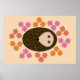This poster features a cute cartoon of a little brown spiky hedgehog curled up in a ball looking sleepy. The Hedgehog is surrounded by pretty flowers. The hedgehog is brown with a cream face and the flowers are red, orange and pink.