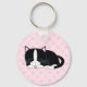 Sweet tuxedo cat cartoon illustration on a light pink pattern of hearts and cat paw prints.