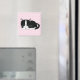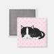 Adorable children's illustration of a cute tuxedo cat on a paw prints and hearts background.