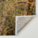 A cute young fox with eyes barely open is enjoying its sunny resting place with a background of autumn colour.