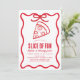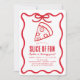 This cute "a slice of fun" kid's birthday invitation features hand-drawn illustrations of a bow and slice of pizza surrounded by a red wavy frame. The reverse side features a white background with a red gingham plaid. Personalize it for your needs. You can find matching products at my store.