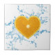 Heart-shaped slice of orange fruit with water splashes on a white background.