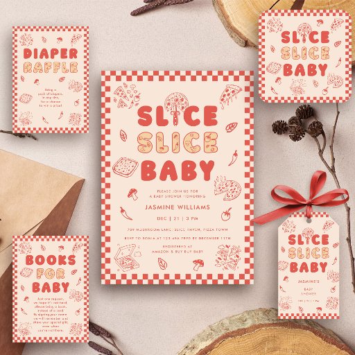 This charming Slice Slice Baby Pizza Hand-Drawn Baby Shower Collection features a playful red plaid frame reminiscent of a classic pizzeria. The bold "SLICE SLICE BABY" tagline takes centre stage, surrounded by whimsical hand-drawn illustrations of pizza slices, fresh ingredients like basil, tomatoes, mushrooms, and peppers, and rustic details that add a cosy, Italian-inspired touch. Perfect for celebrating a little one on the way with a fun and delicious theme! Please get in touch with us for design assistance via Zazzle Chat. We will be sure to respond within 12 hours.