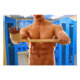 SlipperyJoe muscular man abs locker room tiled flooring gay pride gifts LGBTQIA artistic stretched gymnastic tape shirtless defined torso arms sixpack blue lockers wooden bench gym athletic facility grip strength shirtless chest 6-pack