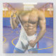 SlipperyJoe's muscular man bulge six-pack gym training facility white athletic singlet blue red ropes hanging from ceiling pulling spandex away from body gay pride gifts LGBTQIA artistic wrestling mat yellow circles padded walls line the room fluorescent lights cast stark glow