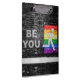 SlipperyJoe's rainbow pride colors panel urban street art style scene gritty industrial alleyway feel artistic graffiti aesthetic LGBTQIA gifts text appearing faded stencil applied white pedestrian walking symbol figure appears midstep arm swinging gray concrete sidewalk rectangular stone dark weathered painted brick wall public mural encouraging individuality self-expression red orange yellow green blue purple dramatic lighting creating spotlight effect