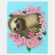 A cute sloth sitting amongst pink flowers against a backdrop of blue