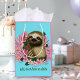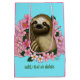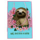 A cute sloth sitting amongst pink flowers against a backdrop of blue