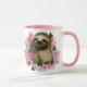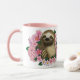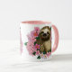 A cute sloth sitting amongst pink flowers against a backdrop of blue