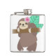 A digital illustration of a sloth with a purple pink flower on its head and leaves behind it. The animal is hanging on a branch.