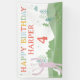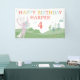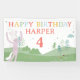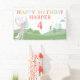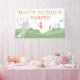 This Slumberkins Unicorn birthday banner design features a joyful pastel unicorn celebrating in a whimsical woodland setting, standing with raised arms in a soft green meadow surrounded by rolling hills, pine trees, tiny stars, clouds, and delicate floral accents. Across the top, “Happy Birthday” appears in soft rainbow lettering, with a custom name and bold age displayed in the centre to create a bright and personalised focal point. The gentle colour palette of blush pink, sage green, sky blue, and warm coral gives the design a magical yet calming feel that’s perfect for little ones, while the clean background allows the unicorn illustration and personalised message to stand out beautifully, making it an eye-catching centerpiece for a unicorn birthday party or woodland-themed celebration that feels special, cheerful, and full of imagination.