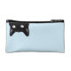 Black cat, hanging down from light blue makeup bag.