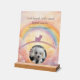 This elegant acrylic memorial sign features a universal small fluffy dog silhouette walking across the Rainbow Bridge, framed by soft watercolor clouds and golden light. A beautiful way to honour your dog’s memory and bring comfort during times of grief.