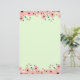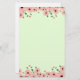 A green stationary with beautiful small pink flowers along the top and bottom sides of the stationary pattern. The flowers have dark red centres and small green leaves on their stems.