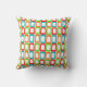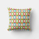 This throw pillow has a mid-century modern design of repeating skewed rectangles in red, orange, green, and turquoise.