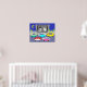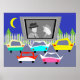 Pass the popcorn! This Small Town Drive-In Movie Poster will transport you to a simpler time, when gas was cheap, rock and roll was young, and the movie stars of Hollywood's Golden Age shined brighter than the night sky. The design features the rear view of five, virtually indestructible, retro cars in colours of red, pink, turquoise, jade and yellow. In front of the cars is a giant movie screen, showing a black and white movie, featuring two, star-crossed lovers in hats and trench coats. In the background, there is a grey, picket fence, a row of green, cedar trees, a royal blue sky and a yellow, crescent moon. We hope you've enjoyed our feature presentation!