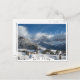 Postcard of the small village Sankt Magdalena in Villnoess valley with the Geisler Dolomites mountain peaks in the background covered in snow in winter season in South Tyrol, Italy with a white edge and the text 'Alto Adige'.