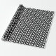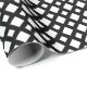 Stylish wrapping paper features a geometric pattern of large and small white diamonds on a black background. The black forms a lattice which separates the diamond shapes.