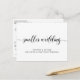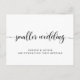 If unforeseen circumstances require you to downsize and reduce attendance at your wedding, you can inform your family and friends who cannot attend that your wedding will be on a smaller, more intimate, scale with this modern and minimal, yet elegant, black and white smaller downsized wedding announcement postcard. "smaller wedding" is written in a stylish script calligraphy with swashes and you can easily personalise the wedding downsize message in more detail, including any virtual wedding events and future celebrations.
