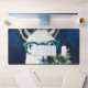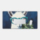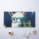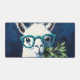 Playful twist to cute animal art and humour with a quirky white llama rocking teal glasses and holding a leafy branch.