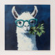 Playful twist to cute animal art and humour with a quirky white llama rocking teal glasses and holding a leafy branch.