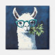 Playful twist to cute animal art and humour with a quirky white llama rocking teal glasses and holding a leafy branch.